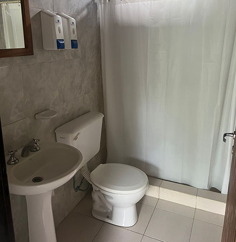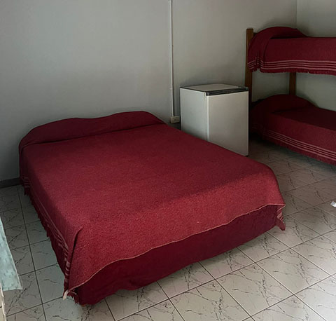 Cama matrimonial somier, dos cuchetas, baño privado con ducha, ventilador, televisor, heladera.